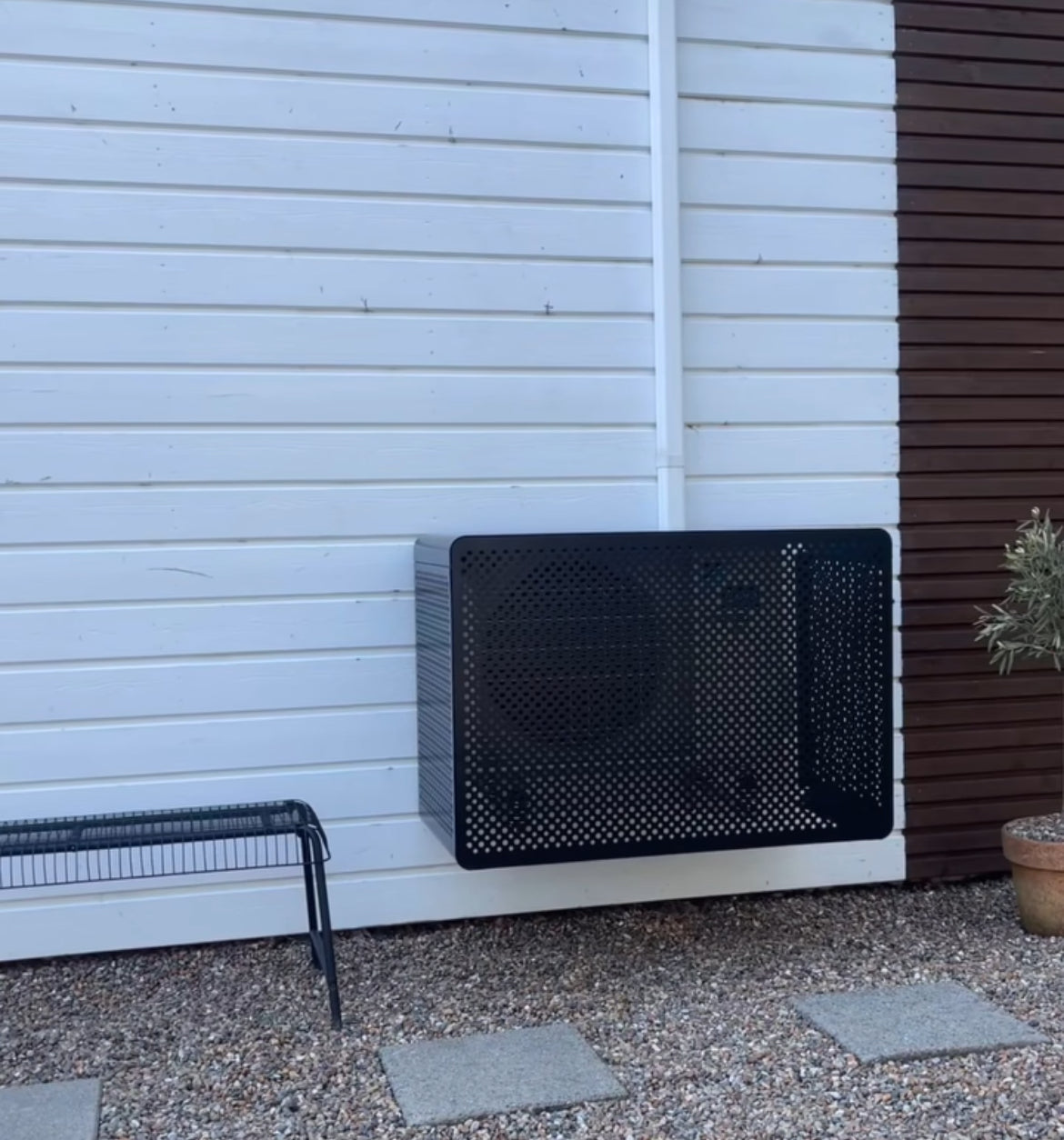 Our aluminum heat pump cover gives your installation an attractive appearance. The rounded corners give a soft and modern look. Suitable for both classic and modern architecture.